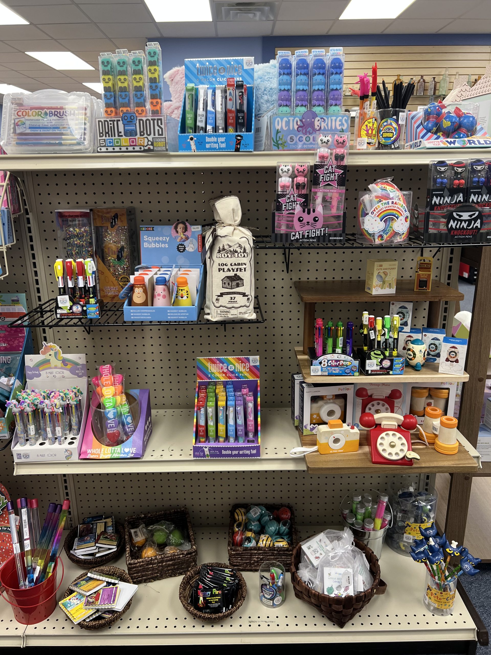 Toys & Fun — Colorful pens, fidget toys, wooden cameras & phones, bubbles, puzzles, and engaging gifts that kids (and kids at heart) love.